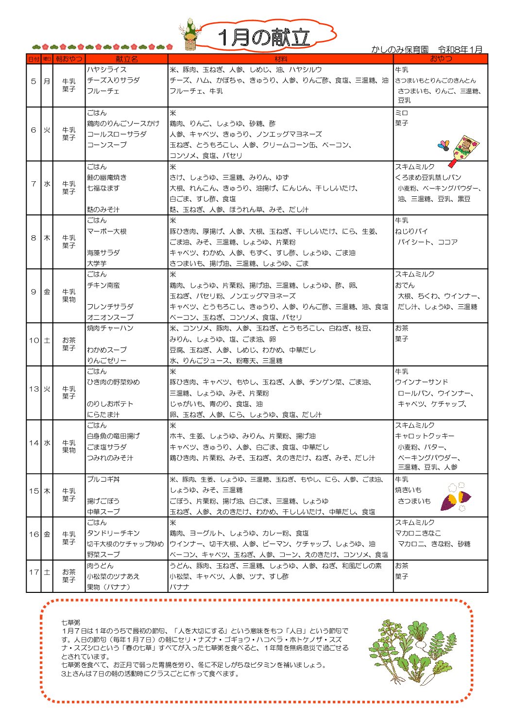 かしのみ保育園 1月献立表